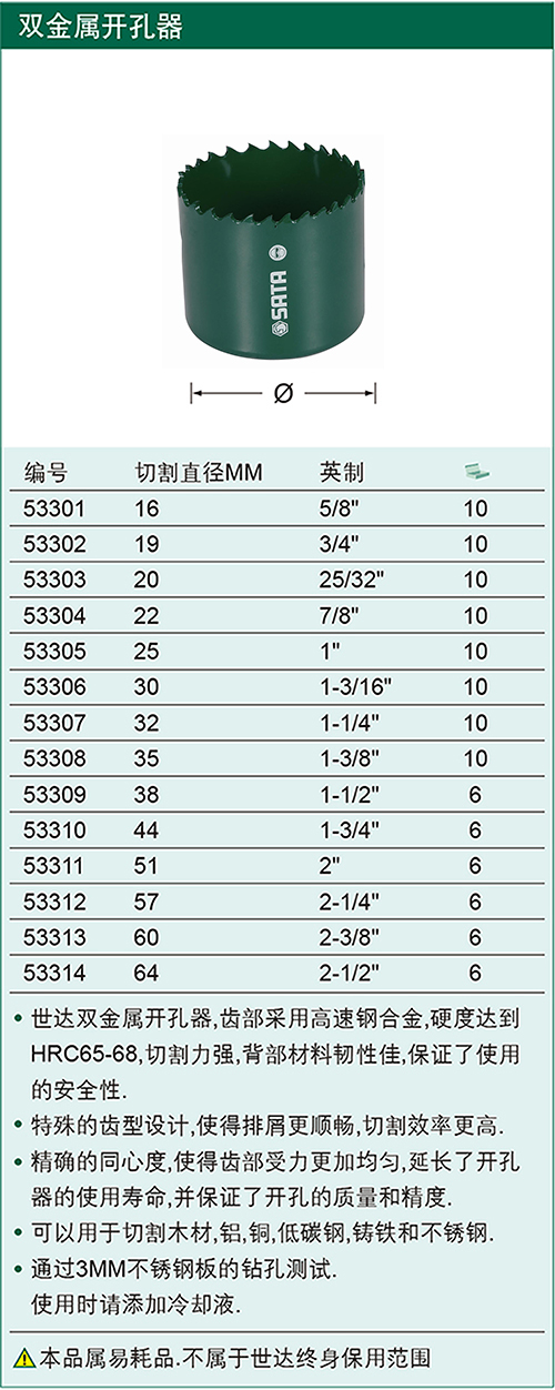 世达双金属开孔器,齿部采用高速钢合金,硬度达到HRC65-68,切割力强,背部材料韧性佳,保证了使用的安全性. 特殊的齿型设计,使得排屑更顺畅,切割效率更高. 精确的同心度,使得齿部受力更加均匀,延长了开孔器的使用寿命,并保证了开孔的质量和精度. 可以用于切割木材,铝,铜,低碳钢,铸铁和不锈钢