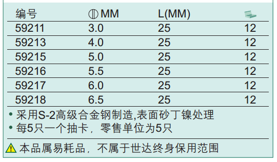 产品名称 5件套6.3MM系列25mm长一字型旋具头 59211-59218