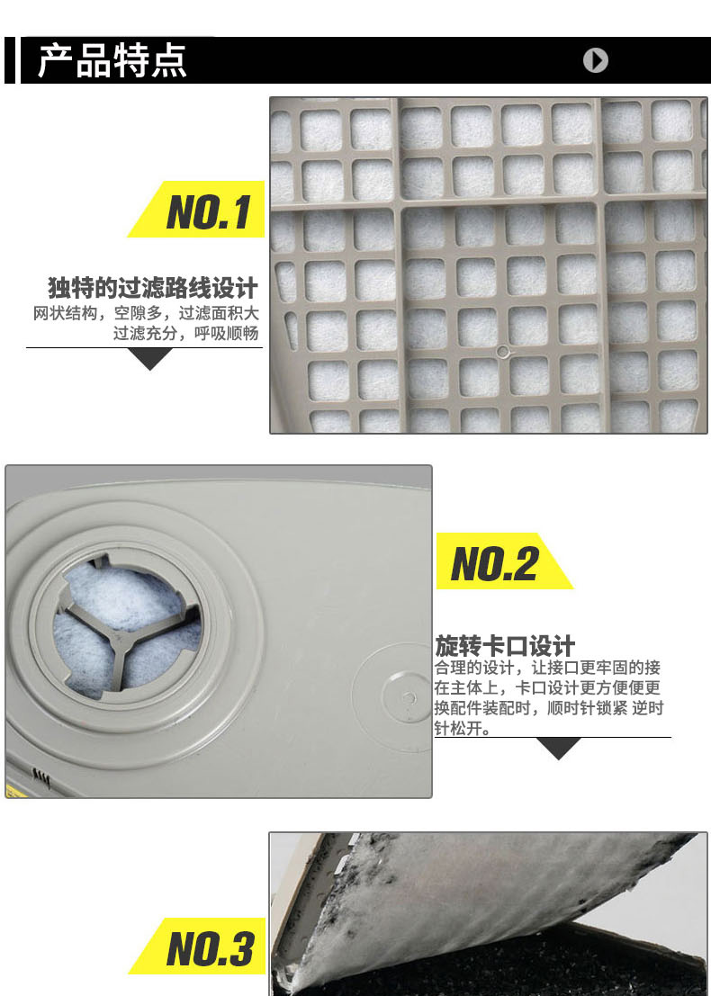 可有效防护有机蒸汽、氯气、二氧化氯、氯化氢、二氧化硫、氟化氢、硫化氢、氨气、甲胺、甲醛等多种气体 |