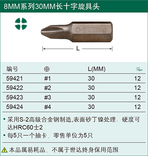 >> 世达(SATA) 5件套8MM系列30mm长十字型旋具头 59421-59424