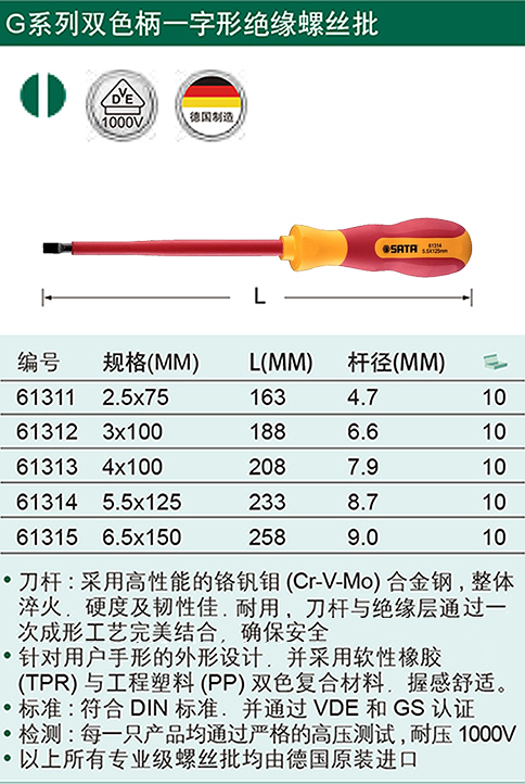| 世达(SATA)专业级双色柄绝缘螺丝批 61311-61315 | |||