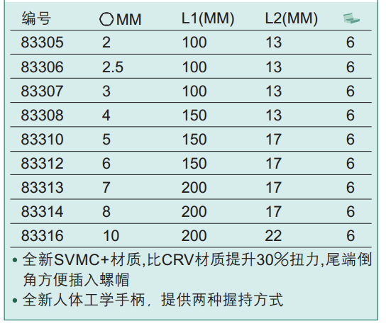 全新SVMC+材质,比CRV材质提升30%扭力,尾端倒角方便插入螺帽 全新人体工学手柄,提供两种握持方式 |