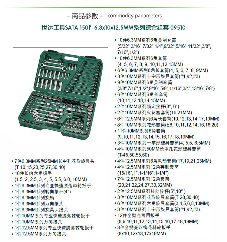 | 世达工具(SATA)150件综合套筒工具箱套装6.3x10x12.5MM系列/09510 | |||