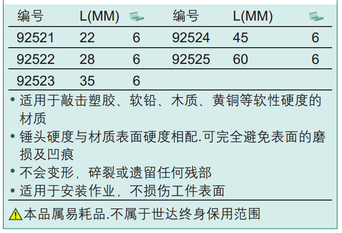 适用于敲击塑胶、软铅、木质、黄铜等软性硬度的材质锤头硬度与材质表面硬度相配.可完全避免表面的磨损及凹痕不会变形,碎裂或遗留任何残部适用于安装作业,不损伤工件表面 |