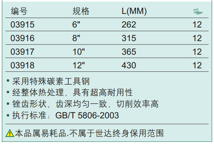采用特殊碳素工具钢,锉身硬度达到63~66HRC 经整体热处理,具有超高耐用性,锉齿形状、齿深均匀一致,切削效率高 |