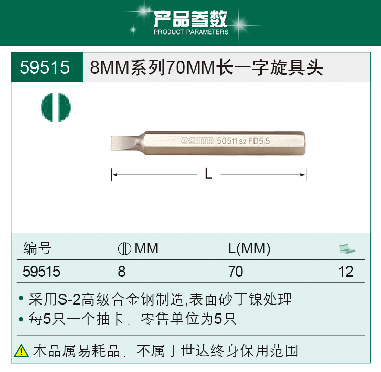 | 世达手动五金工具 (SATA)8MM系列70MM长一字螺丝批起子旋具头 /59515 | |||