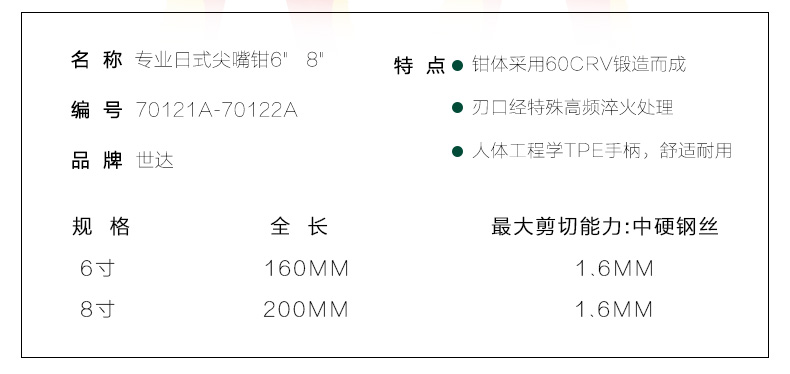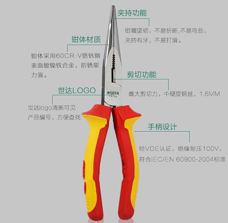 | 世达工具(SATA) VDE绝缘耐压尖嘴钳70131 70132 |