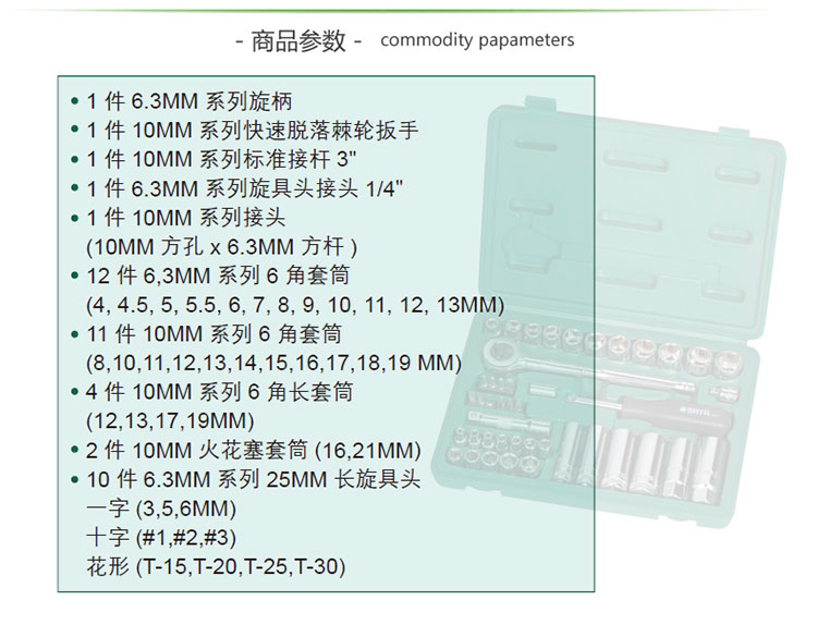 产品名称 44件6.3*10MM系列套筒及旋具头组套 09527