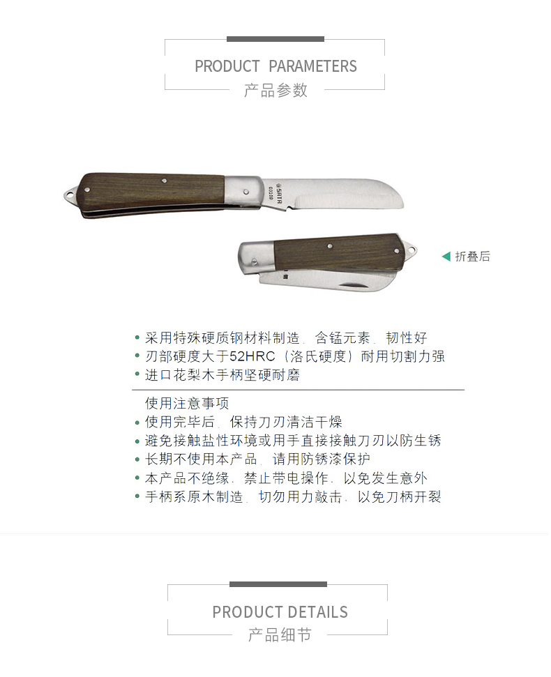 采用特殊硬质钢材料制造,含锰元素,韧性好 刃部硬度大于52HRC(洛氏硬度)耐用切割力强 进口花梨木手柄坚硬耐磨 |