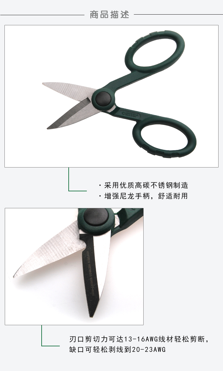 采用优质高碳不锈钢制造,硬度达到 HRC52-56(洛氏硬度) 增强尼龙手柄,舒适耐用 锯齿型刀刃可夹持工件,剪切时不打滑 |