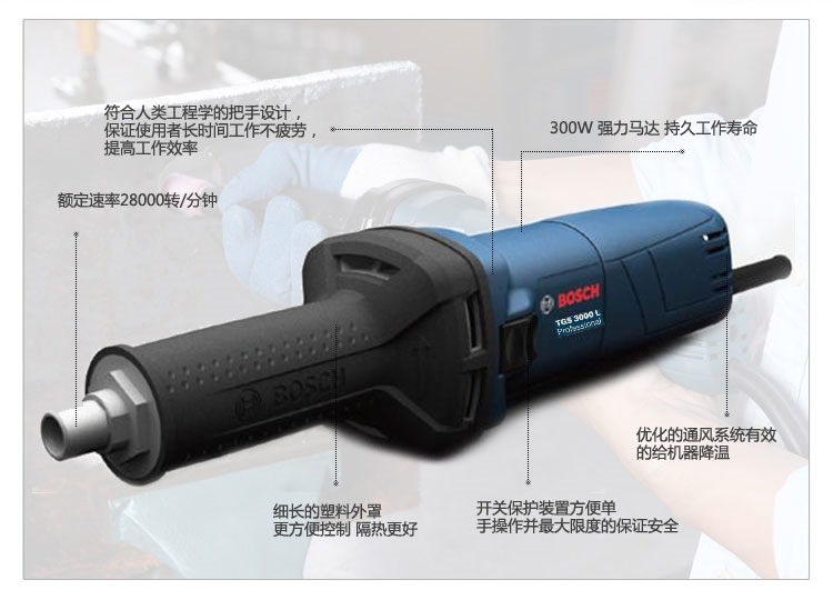 博世(BoschTGS3000L直磨机T系列符合人类工程学的把手设计,保证使用者长时间工作不疲劳,提高工作效率。开关保护装置方便单手操作并很大大限度的保证安全 |