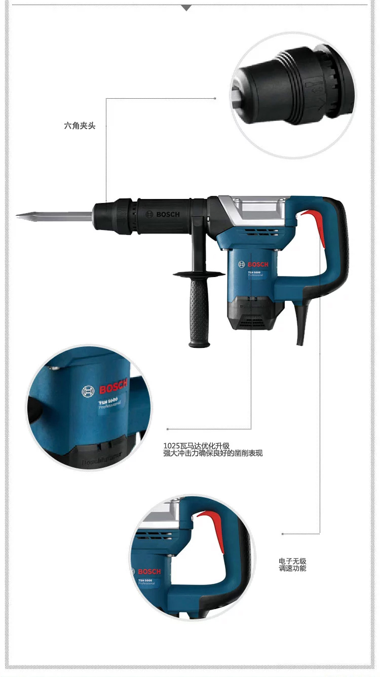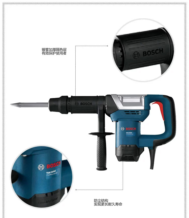 博世(BOSCH)电镐TSH5000大功率工业级电动工具,强大冲击力,材料移除效率高,适合连续削凿作业,使用寿命长 |