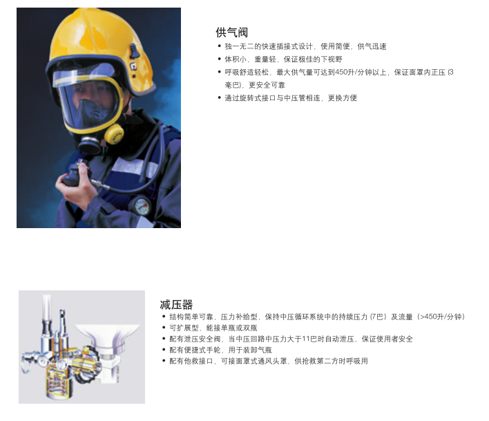 • 呼吸舒适轻松,供气量可达到450升/分钟以上,保证面罩内正压 (3毫巴),更安全可靠