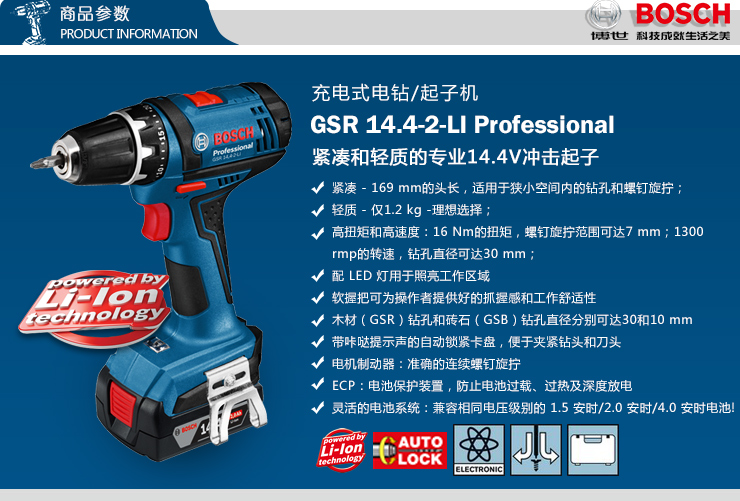 博世BOSCH GSR 14.4-2-LI锂电池充电式电钻/起子机电动螺丝刀,双速齿轮设计,分别用于起子和钻孔。防止电池过载、过热及深度放电。 |
