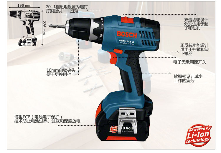 博世电动工具充电式电钻 电动螺丝刀GSR18-2-LI 锂电电动起子机