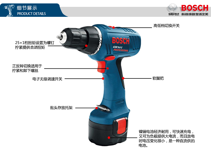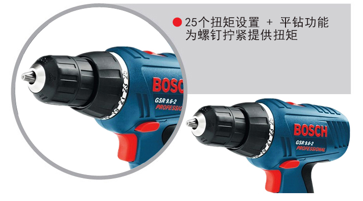 博世GSR9.6-2镍铬充电式电钻/起子机,25个扭矩设置+平钻功能,紧凑尺寸使得操控性,软握把可为操作者提供很好的抓握感和工作舒适性。 |