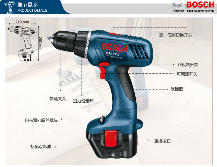 | 博世(BOSCH)GSR 12-2镍铬充电式电钻家用起子机 电动螺丝刀(601918J80) | |||