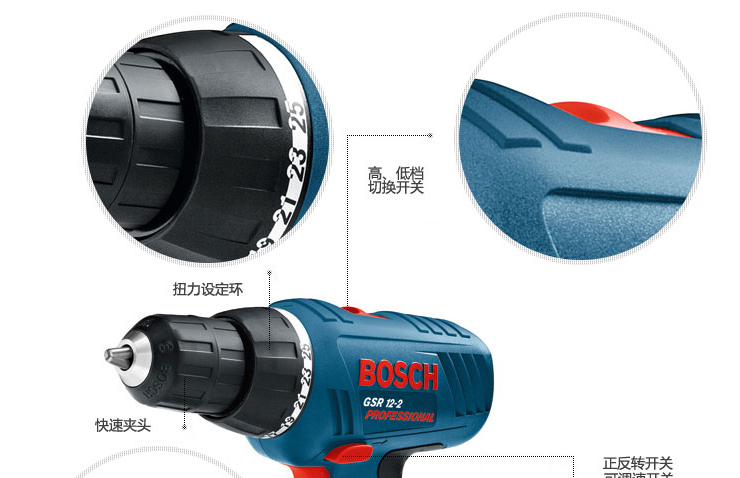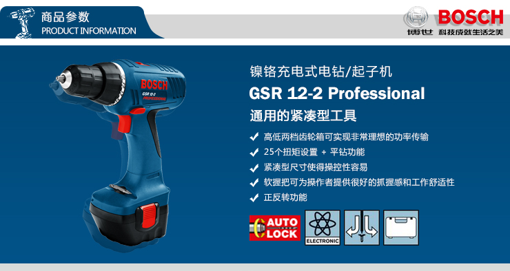 博世GSR12-2镍铬充电式电钻/起子机,高低两档齿轮箱可实现非常理想的功率传输,25个扭矩设置+平钻功能,配LED灯,即使在黑暗处仍可正常作业。 |