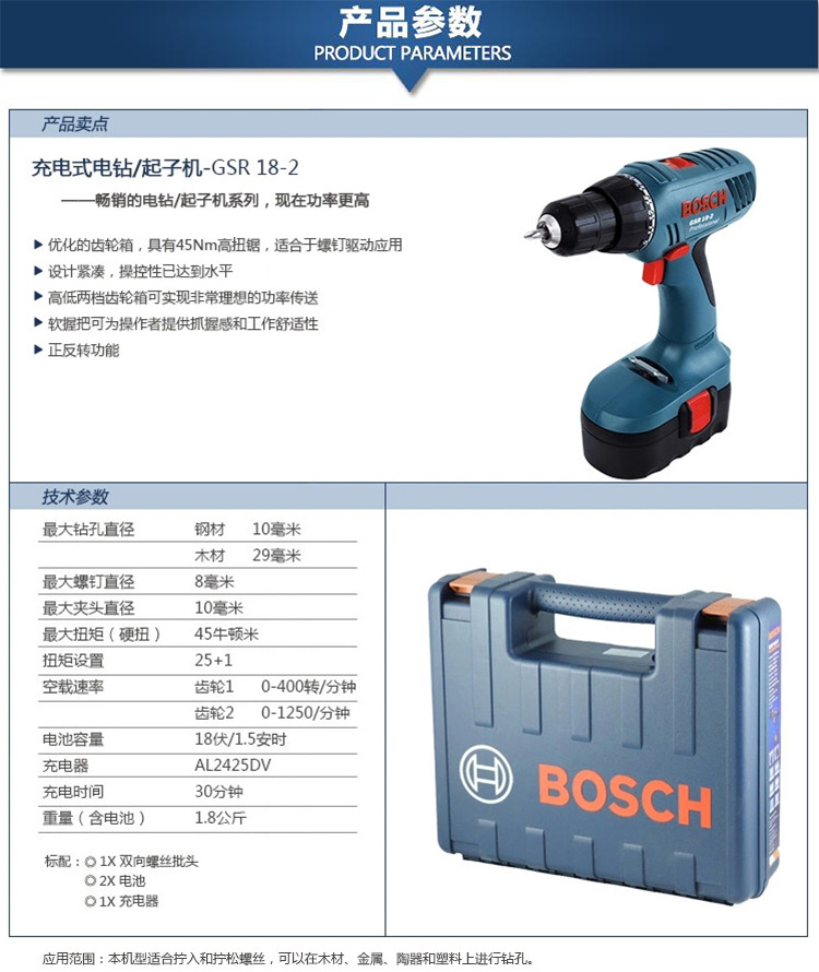 | 博世(BOSCH)GSR 18-2镍铬充电式电钻/起子机 GSR 18-2整机标配(601918380) | |||