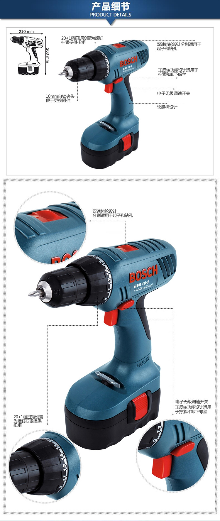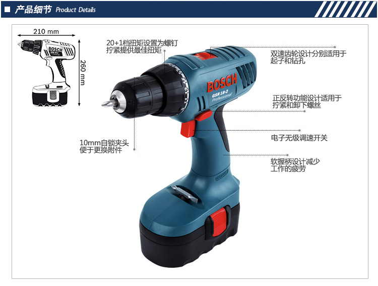 博世GSR 18-2镍铬充电式电钻/起子机,优化的齿轮箱,具有45Nm高扭锯,适合于螺钉驱动应用,高低两档齿轮箱可实现非常理想的功率传送,软握把可为操作者提供抓握感和工作舒适性。 |