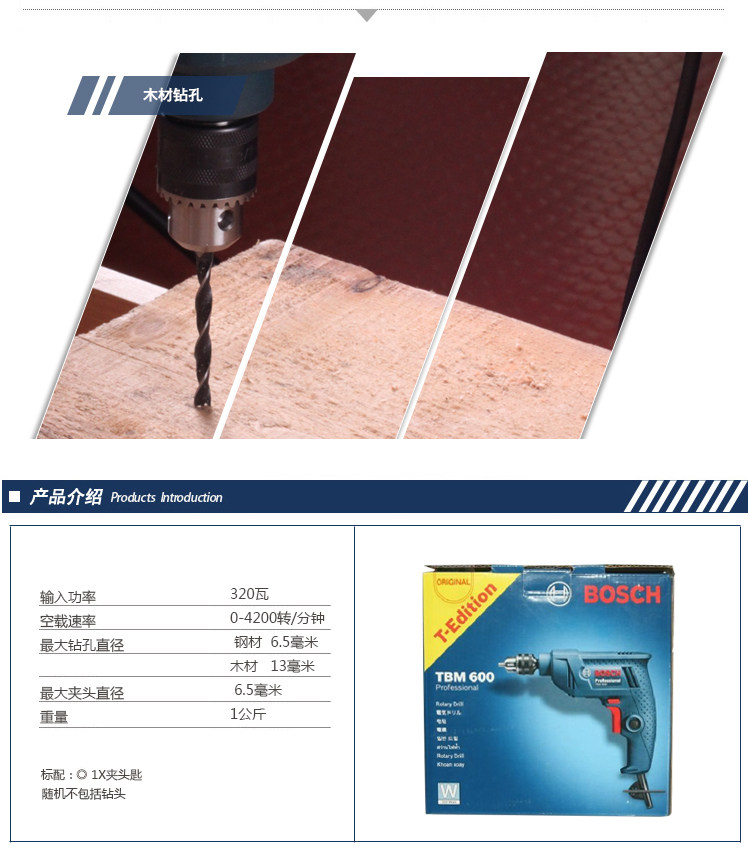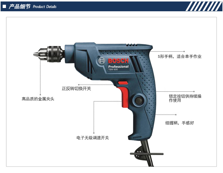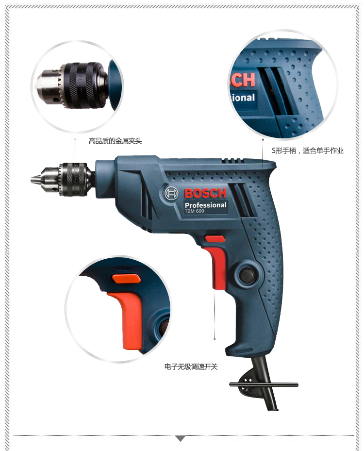 博世BOSCH手电钻T系列6.5mm迷你调速正反TBM600电钻,S型手柄,适合单手作业,锁定按钮,可供长时间操作使用 |