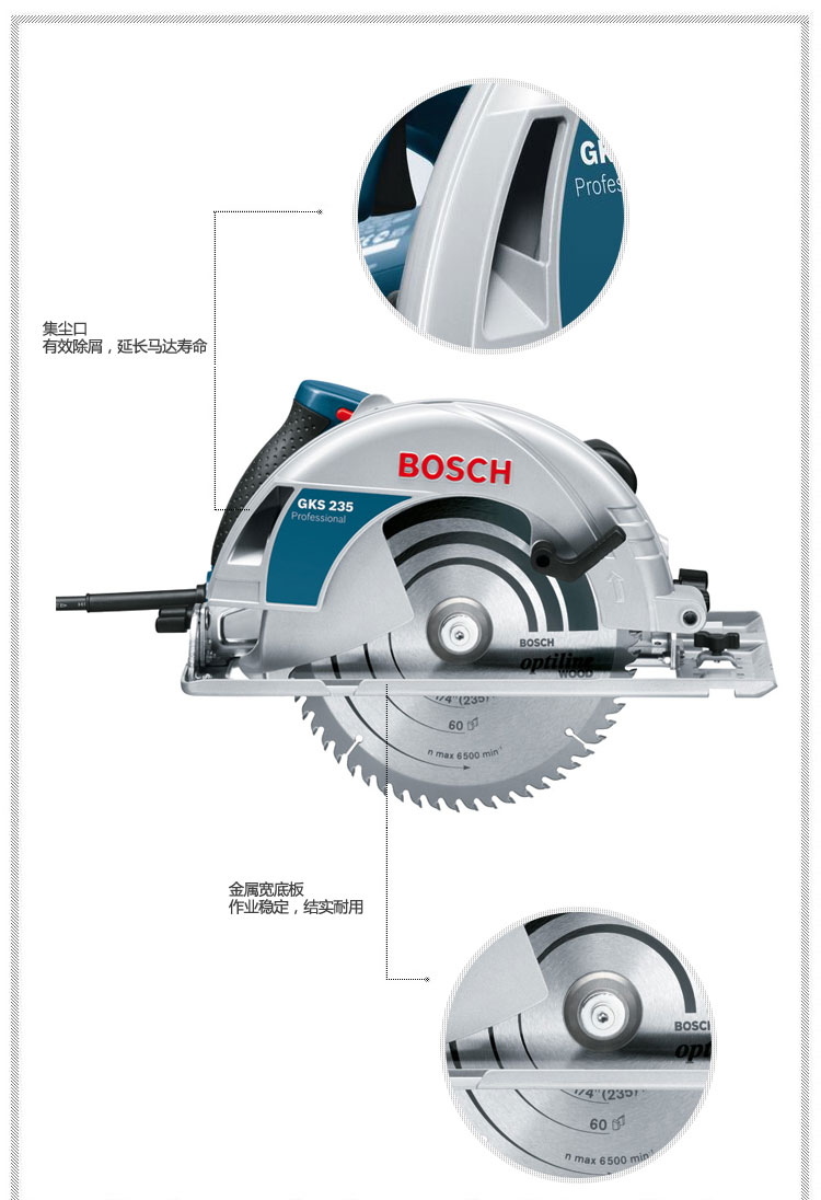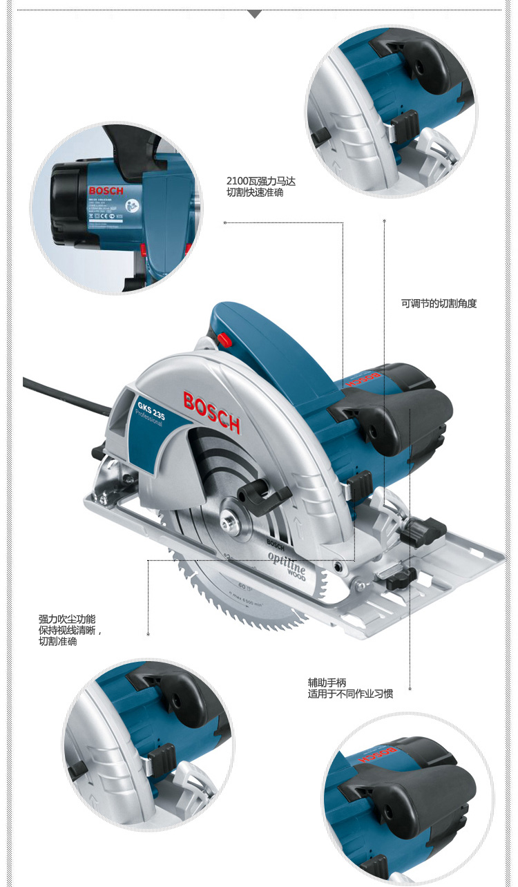 博世BOSCH电圆锯GKS235木工手提切割机235mm(,优化的排屑系统可确保材料表面更加光洁,涡轮吹尘装置,可实现切割表面的无尘化 |