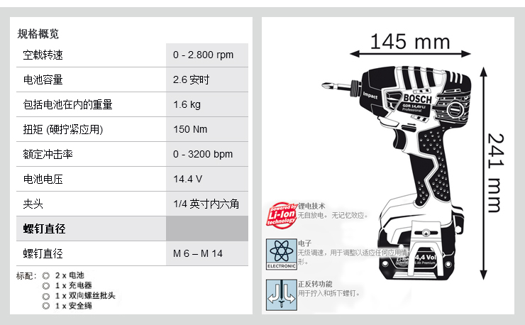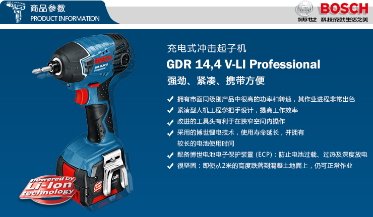 博世(BOSCH)电动螺丝刀GDR 14.4 V-LI锂电池充电式冲击起子机,拥有市面同级别产品中很高的功率和转速,其作业进程非常出色,电池保护装置(ECP)防止电池过载、过热。 |