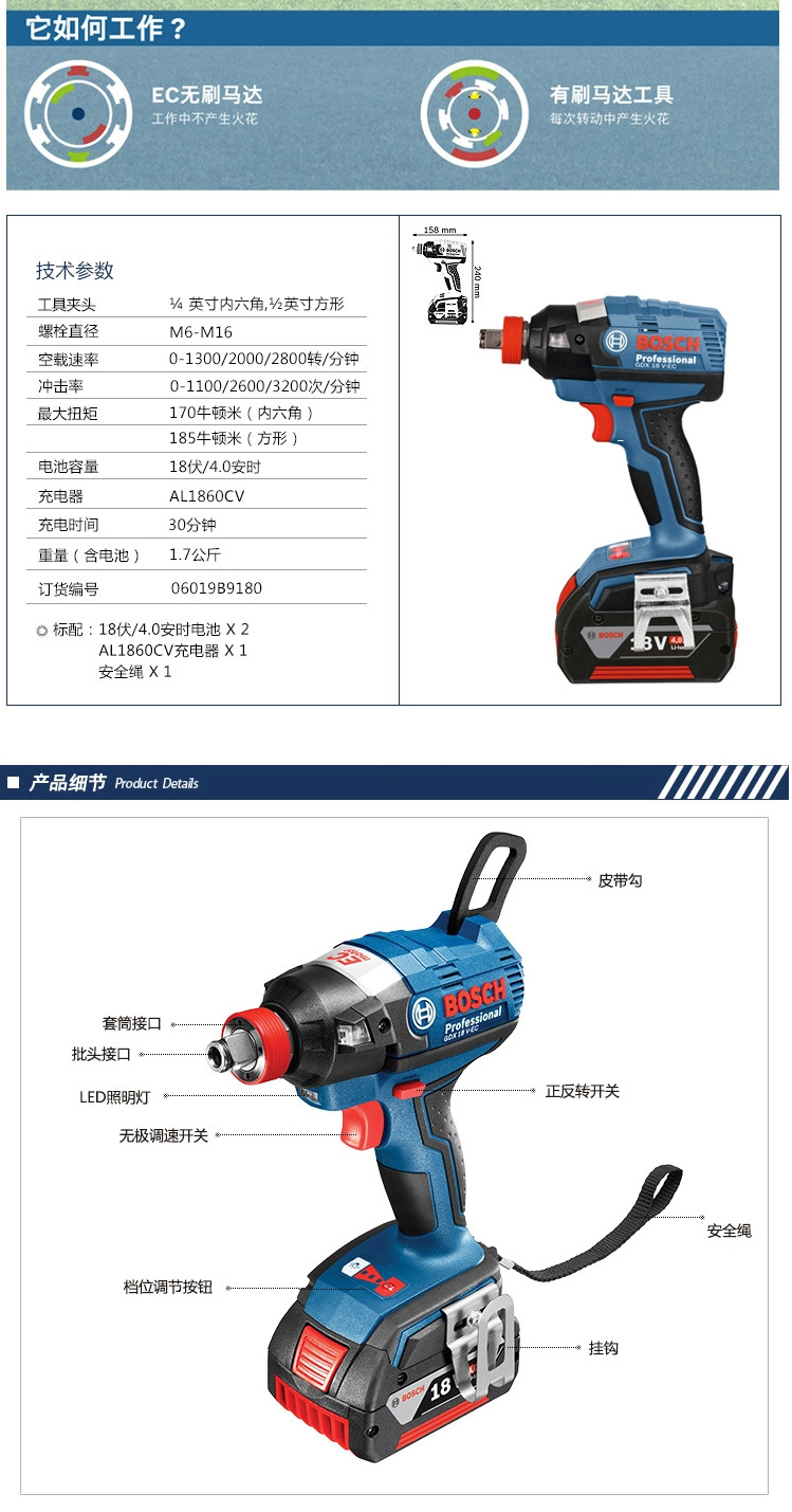 GDX18V-EC锂电充电式冲击起子机/扳手机,搭配EC无碳刷马达,动力更强劲,运行时间和使用寿命更长,三挡转速设定,使工作更便捷。博世电池电子保护装置(ECP)防止电池过载、过热。 |