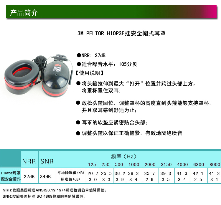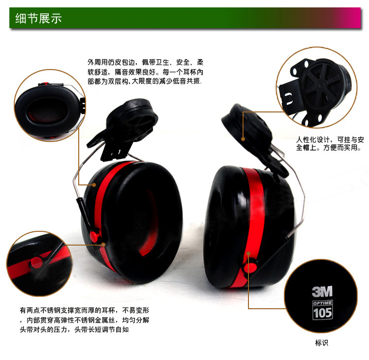 产品特征:*适合噪音水平105分贝;*坚固的金属环头箍结构,经得起恶劣环境的高要求考验;*针对各种应用环境提供多种声音衰减级别产品;*外周用仿皮报边,佩戴卫生安全,柔软舒适;*人性化设计方便实用。适用范围:在家里、寝室、教室、乘车船飞机旅行、工厂、建筑工地、繁华市区等处免受噪声干扰的好帮手。产品用途:集中精神提高学习和工作效率,高降噪值、拥有清凉透气设计的防噪音产品。