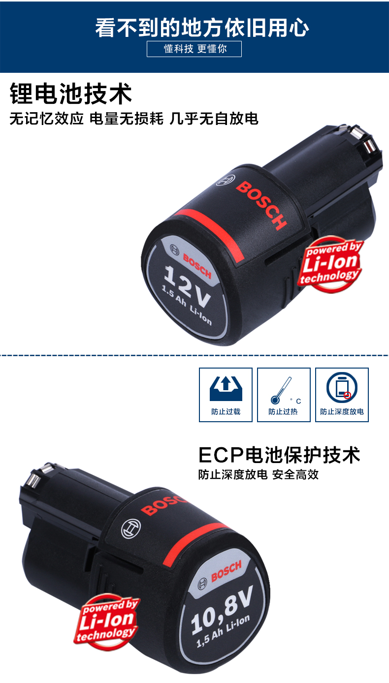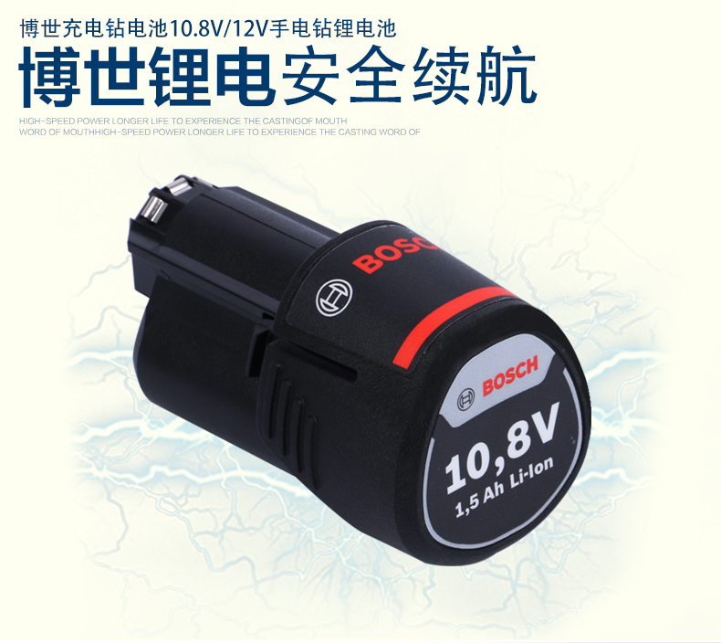 博世(BOSCH)10.8V/1.5AH电池,紧凑型10.8伏1.5安时电池与1.3安时电池相比,运行时间更长,产品更紧凑和轻质的蓄电池,适用于适配TSR1080/GSR120。 |