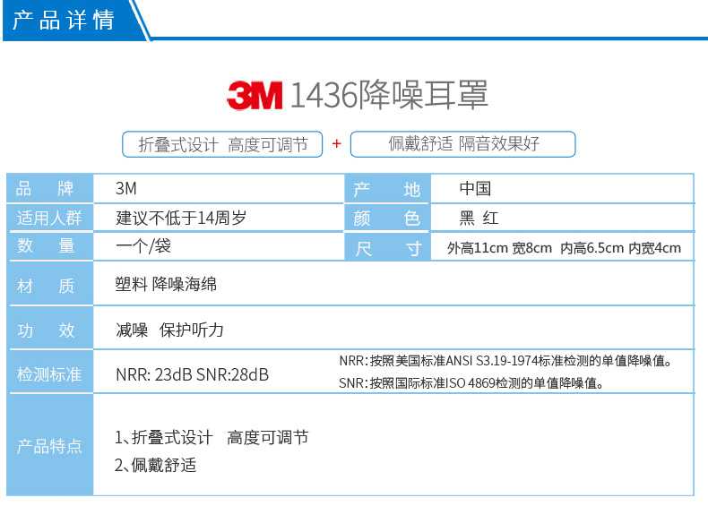 | 3M 1436折叠式耳罩 降噪 睡眠 学习 射击 NRR降噪23分贝 |
