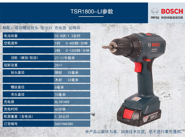 | 博世BOSCH电动工具TSR1800-LI充电式电钻T系列18V起子机调速正反转手电钻(6019A8381) | |||