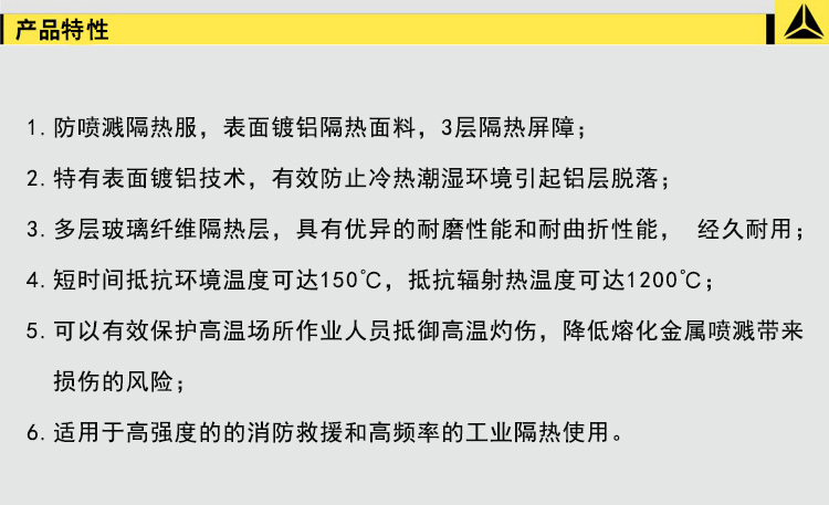 1、防喷溅隔热服,表面镀铝隔热面料,3层隔热屏障