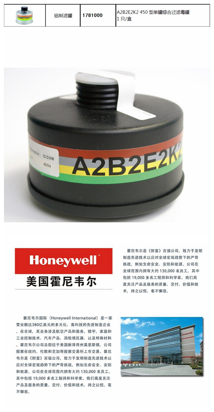 | 霍尼韦尔1781000 A2B2E2K2 450 型单罐综合过滤毒罐 |