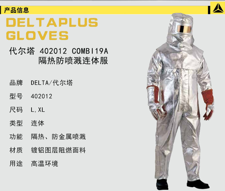 | 代尔塔 COMBI19A隔热防喷溅连体服带帽连体防尘服防化服/402012 |