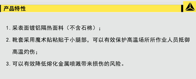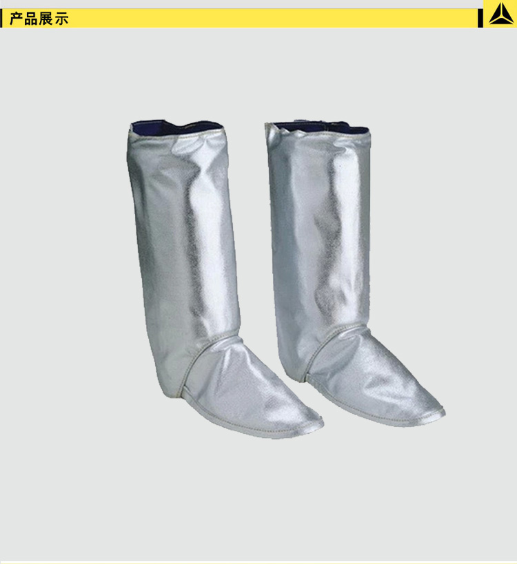 1、采用表面镀铝隔热面料,靴套采用魔术贴粘贴于小腿,有效抵御高温灼伤