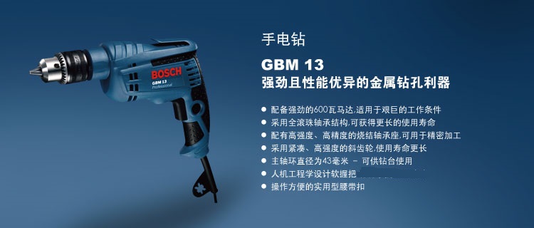 博世(BOSCH) GBM 13 手电钻 配备强劲的600瓦马达,适用于艰巨的工作条件 采用全滚珠轴承结构,可获得更长的使用寿命 配有高强度、高精度的烧结轴承座,可用于精密加工 |