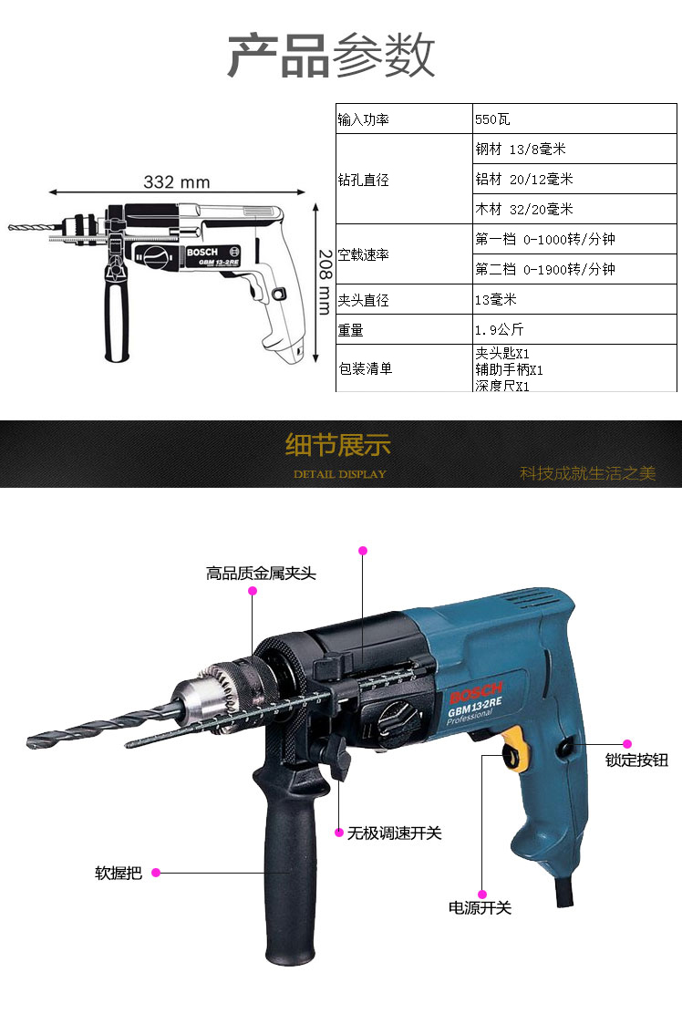 >> 博世(BOSCH)GBM 13-2RE 瑞士原装进口13mm(高低档调速)手电钻/正反转(601169543)