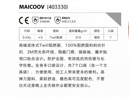 1、高端连体式Twill阻燃服,高弹力面料,柔软舒适