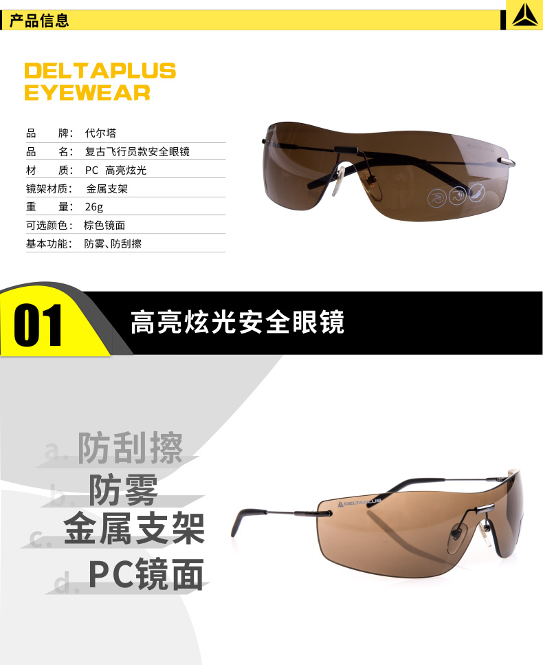 | 代尔塔 飞行员款防护眼镜安全护目镜骑行防雾防刮擦金属支架/101137 |
