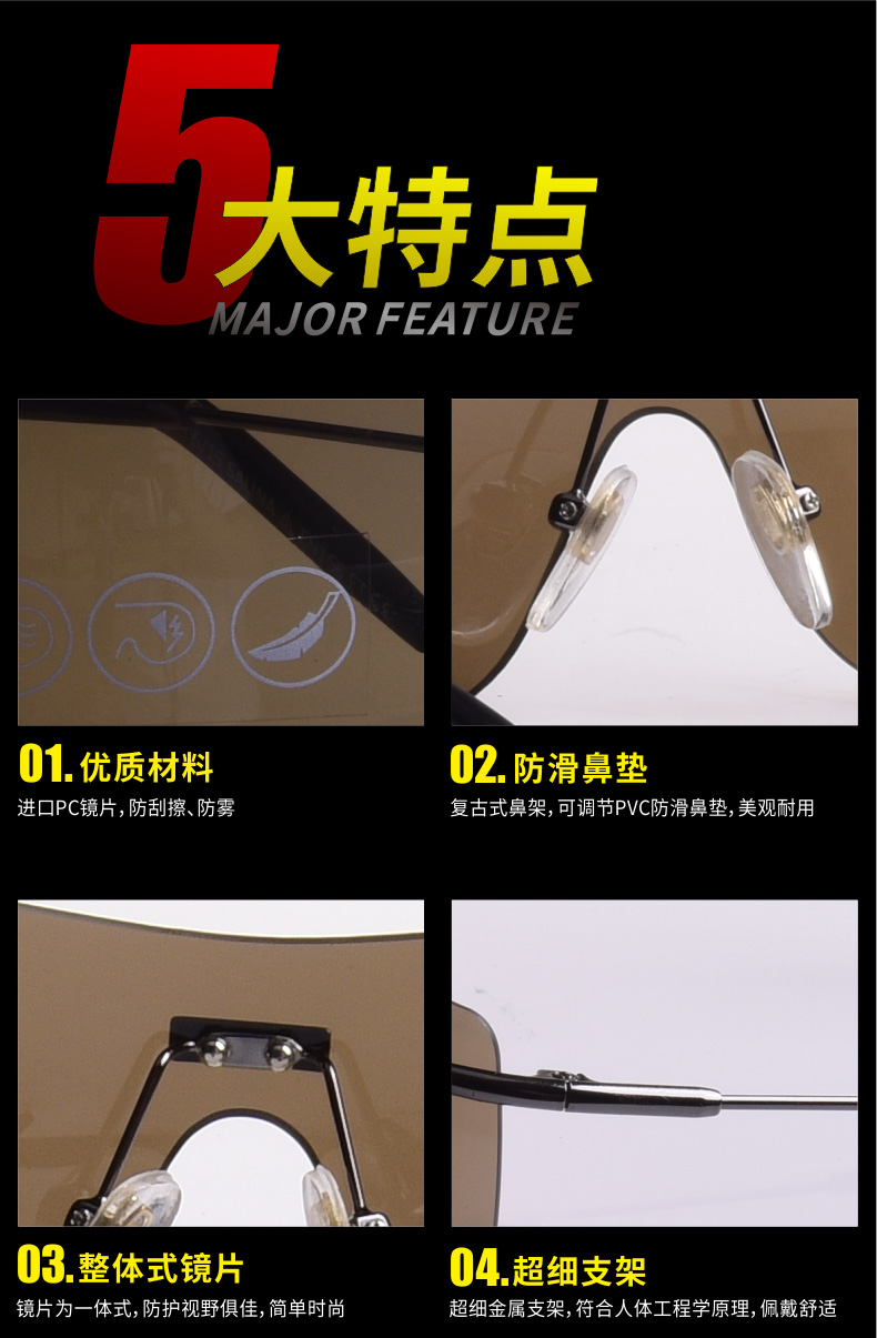 1、进口PC镜片,防刮擦、防雾