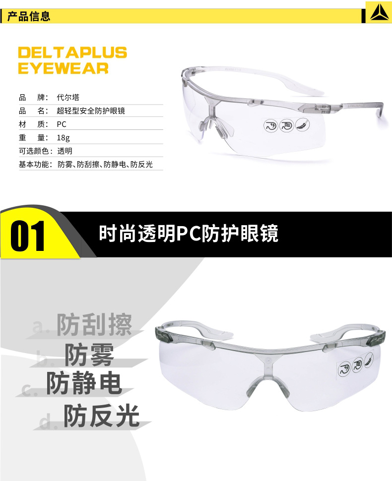 | 代尔塔防护眼镜防刮擦防雾 轻便安全眼镜防静电防反光骑行/101138 |