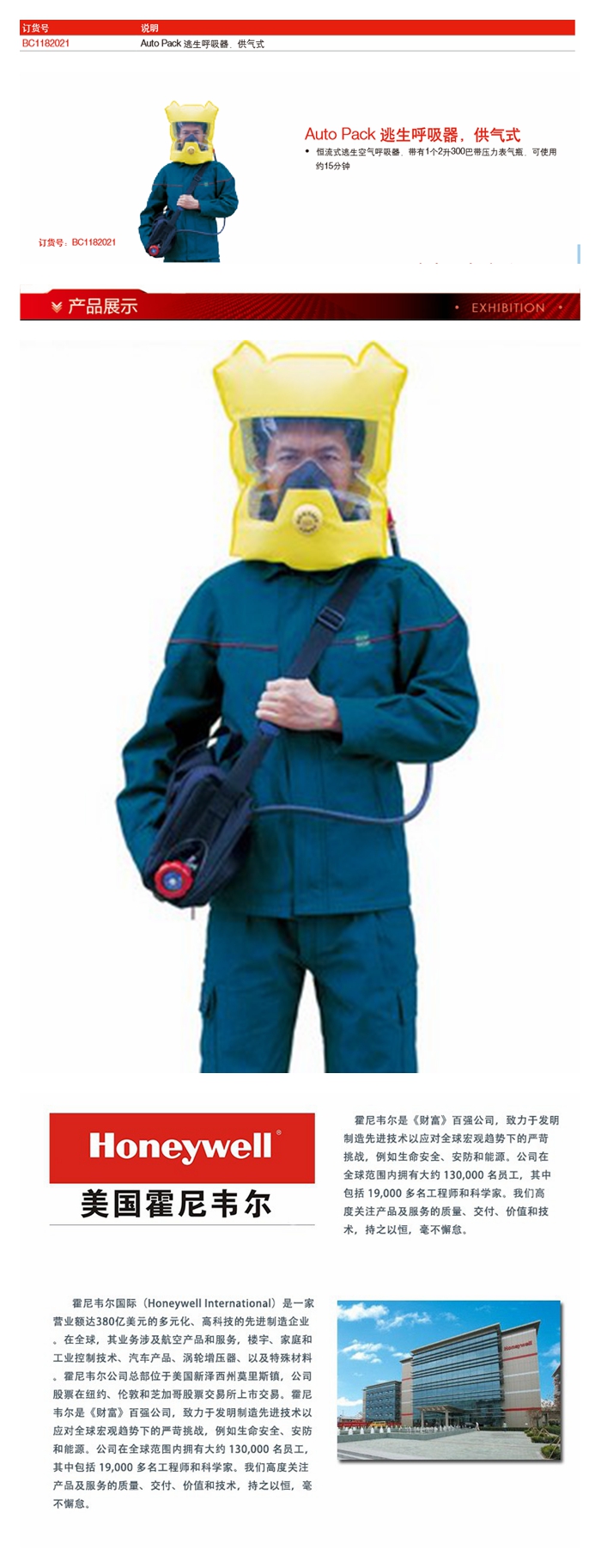 | 霍尼韦尔BC1182021 挎包式AUTOPACK 逃生呼吸器(头罩) | |||