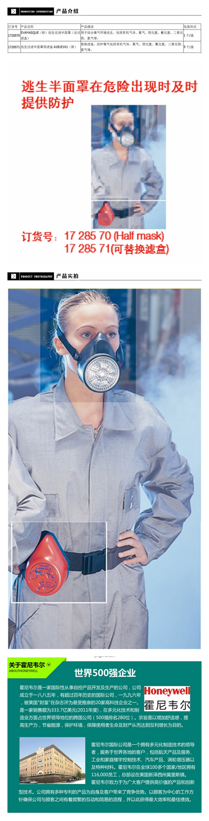 | 霍尼韦尔1728570/1728571 EVAMASQUE逃生过滤半面罩(含过滤盒)/可替换滤盒A1B1E1K1 | |||