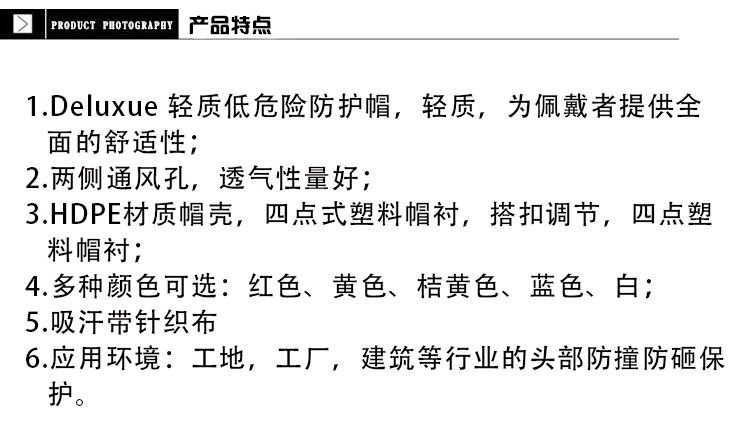 Deluxue 轻质低危险防护帽,轻质,为佩戴者提供全面的舒适性,透气性好,多色可选 |