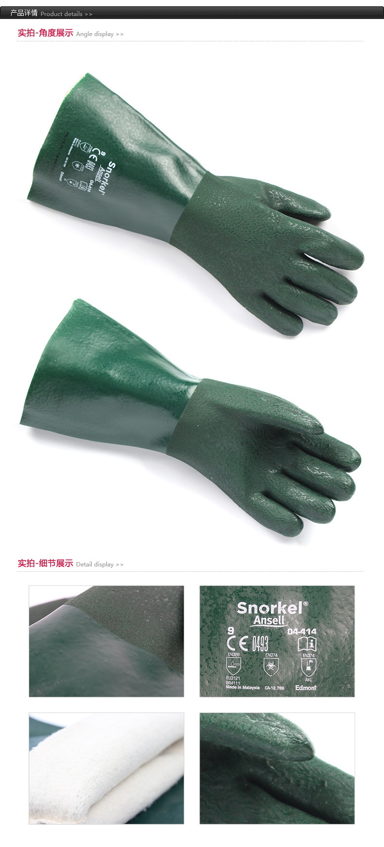 Ansell//安思尔4-414 丁腈合成橡胶防溶剂手套(4-414) 1. 高级重型PVC和丁腈橡胶合成的手套,粗糙表面以提高抓握性。与手型的自然匹配,可以提供更佳的舒适性和灵活性。 2.即使在低温环境下,也保持很好的灵活性和弹性;优异的湿抓性;贴合手型的设计使得佩戴时更舒适;对酸、苛性碱和溶剂有优异的防护性能。 |