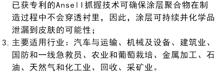 2.可靠的化学防护性能为使用者增加额外安全保障,已获专利的Ansell抓握技术可确保涂层聚合