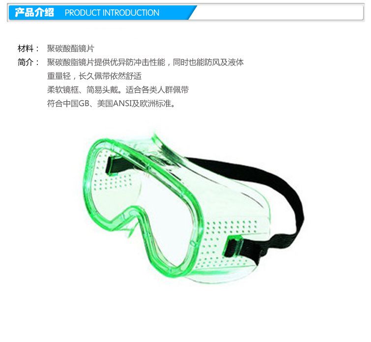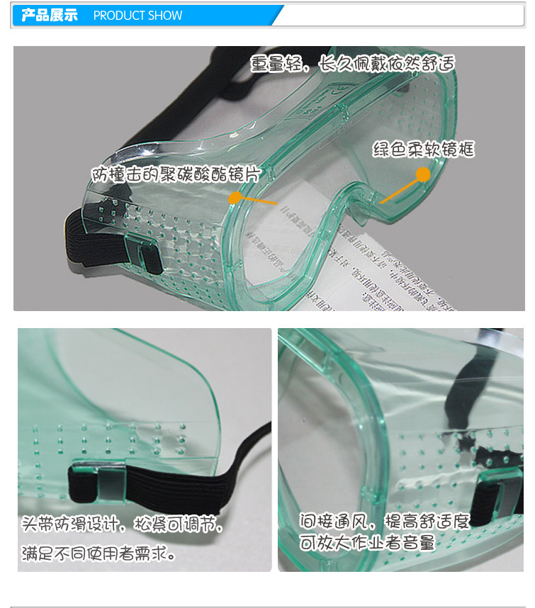 柔软大镜框,佩带舒适,间接通风,有四个带帽的通风孔