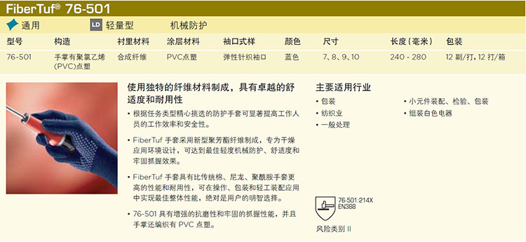 安思尔ansell 76-501, FiberTuf 手套采用新型聚酯纤维制成,专为干燥应用环境设计,可达到轻度机械防护、舒适度和牢固抓握效果。 |