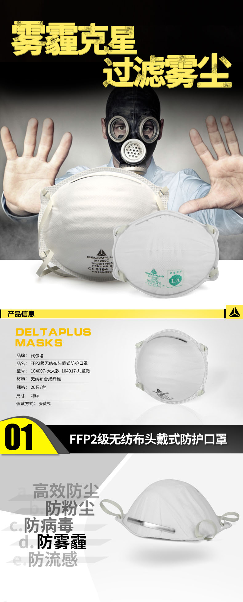 >> 代尔塔 104017 FFP2 防尘 尘埃 口罩 雾霾 防护 无纺布 轻便型